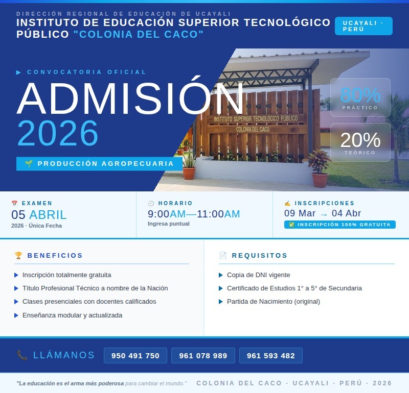 El Instituto de Educación Superior Tecnológico Público «Colonia del Caco». A nombre de la dirección, personal jerarquico y plana docente saluda cordialmente al distrito de Iparia y comunidades aledañas. En cumplimiento de nuestro calendario académico, informamos el inicio de las inscripciones para el Examen de Admisión 2026. Se convoca a todos los egresados de Educación Secundaria a participar en el proceso para nuestro Programa de estudio de: Producción Agropecuaria